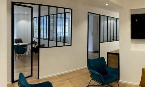 Conçues pour les espaces en angle à 90°, ces verrières créent des séparations lumineuses sans cloisonner totalement les pièces. Elles sont disponibles en grands carreaux ou avec imposte.