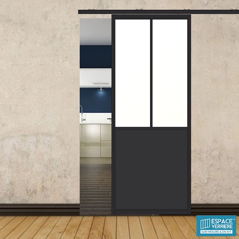 Porte coulissante H 2088 x L 867 mm - 2 sections verticales + soubassement bois: PORTE SIMPLE COULISSANTE DROITE - H2088 L867 mm - 2 VERRES VERTICAUX + SOUBASSEMENT BOIS - 6 mm OPALE - NOIR