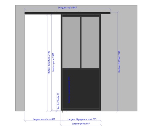 Porte coulissante H 2088 x L 867 mm - 2 sections verticales + soubassement bois: PORTE SIMPLE COULISSANTE GAUCHE - H2088 L867 mm - 2 VERRES VERTICAUX + SOUBASSEMENT BOIS - 6 mm CLAIR - NOIR