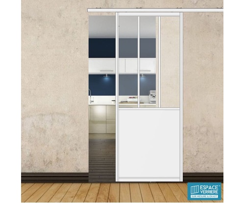 Porte coulissante H 2088 x L 867 mm - 3 sections verticales + soubassement tôle: PORTE SIMPLE COULISSANTE DROITE - H2088 L867 mm - 3 VERRES VERTICAUX + SOUBASSEMENT TÔLE - 6 mm OPALE - BLANC