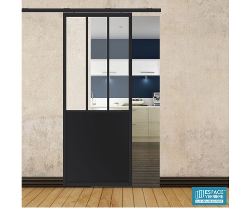 Porte coulissante H 2088 x L 867 mm - 3 sections verticales + soubassement tôle: PORTE SIMPLE COULISSANTE DROITE - H2088 L867 mm - 3 VERRES VERTICAUX + SOUBASSEMENT TÔLE - 6 mm CLAIR - NOIR