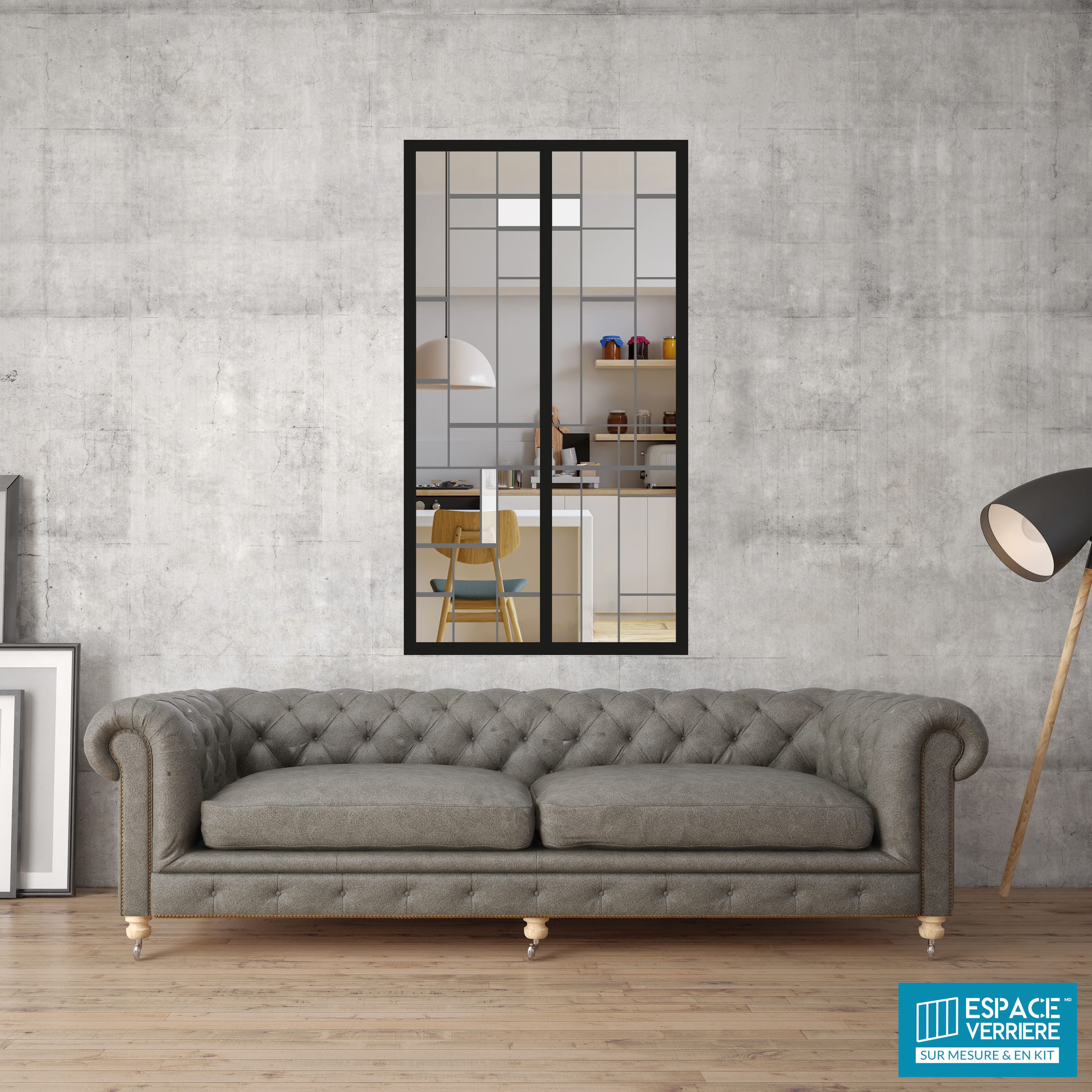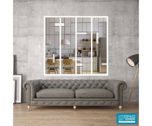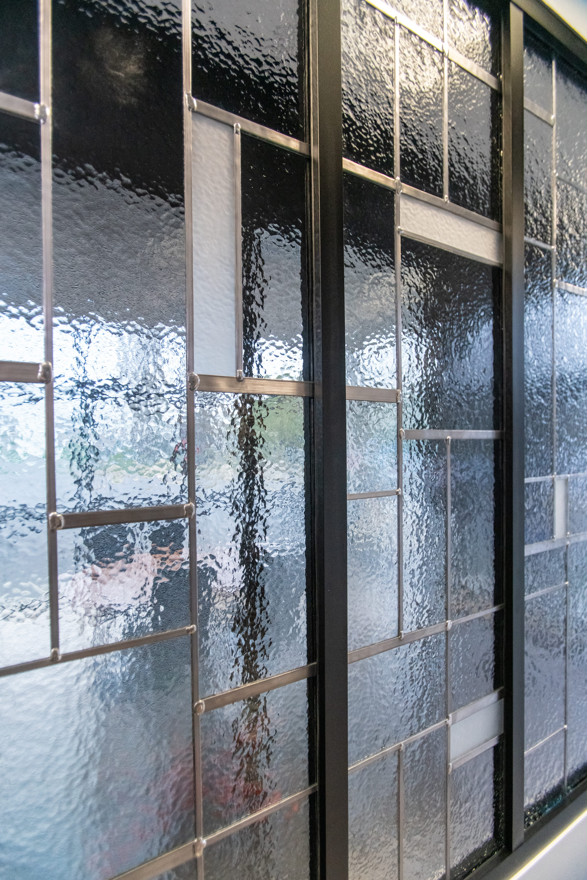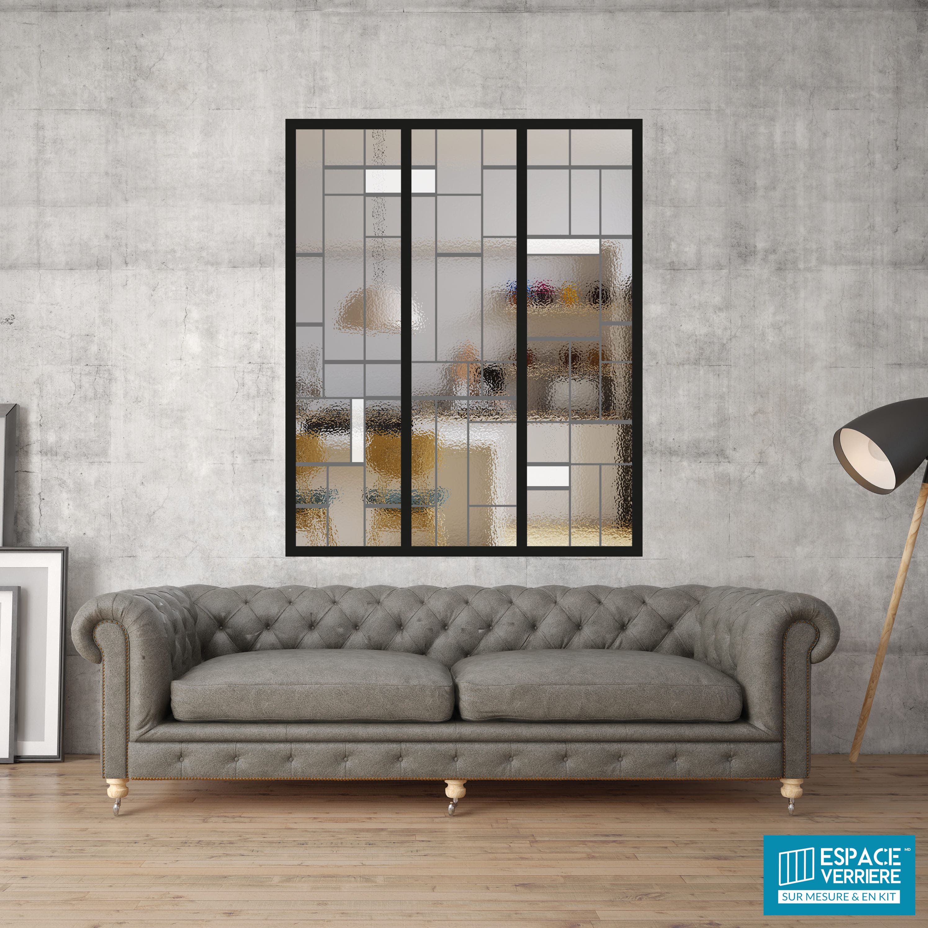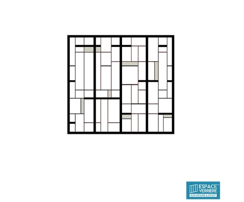 Cette composition résolument moderne vient accentuer le caractère industriel de votre verrière et saura apporter une touche de décoration unique dans votre intérieur. Les trames de plomb de différentes largeurs et les zones sablées donne à la composition du rythme et un style indémodable.